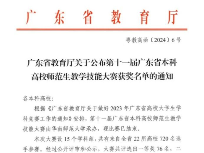 2023年9月24日,由广东省教育厅主办、华南师范大学承办的第十一届广东省本科高校师范生教学技能大赛(小学教育组)决赛在华南师范大学石牌校区举行。经过校内初赛(2022-2023学年第一学期小学教育专业2021级师范生教师职业能力大赛)推选和省赛组委会初选后,williamhill英国官网两名参赛选手:朱琳(指导教师:潘昕迪、魏林苹)和程琳(指导教师:赵中宝)代表学校入围决赛圈,并获得了三等奖的好成绩。首次参赛即获奖,这与williamhill英国官网在人才培养、...