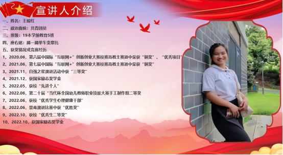 王嫦红同学也毫无保留地向大家分享了她在向国家励志奖学金奋斗学习的道路上所积累的经验,并解读了注意事项和相关文件。她给同学们提出了六点建议∶第一,明确目标,了解国家资助和地方政府资助,明确自己的学习方向。第二,逆袭成长,我们的大学生涯其实很短,时间悄然而逝,要好好珍惜上课时间。第三,刻苦学习,多和同学们一起学习交流。四,参加比赛,在实战中逐渐培养自己的能力。第五,加入社团,在社团中可以遇见一群志同道合的同学,一起把热爱的事情变得专业。第六,多做志愿,在为他人提供服务的时候,我们也能找到自己的价值所在。王嫦红同学的座右铭是:搏一搏,单车变摩托。她激励同学们,要抓住机会,努力拼搏,就能离目标与梦想越来越近,机会总是留给努力奋斗的人。