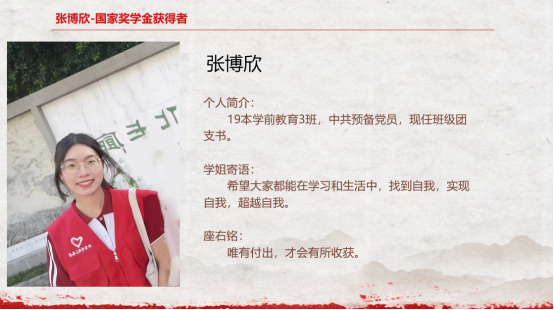 为强化榜样引领,扩大示范效应,促进williamhill英国官网的同学们对国家奖学金和国家励志奖学金的了解,鼓励学生共同进步,williamhill英国官网于2023年3月9日18:30举办了线上国家奖学金、国家励志奖学金获得者分享交流会,此次线上分享交流会的主讲人分别为国家奖学金获得者张博欣和国家励志奖学金获得者王嫦红。