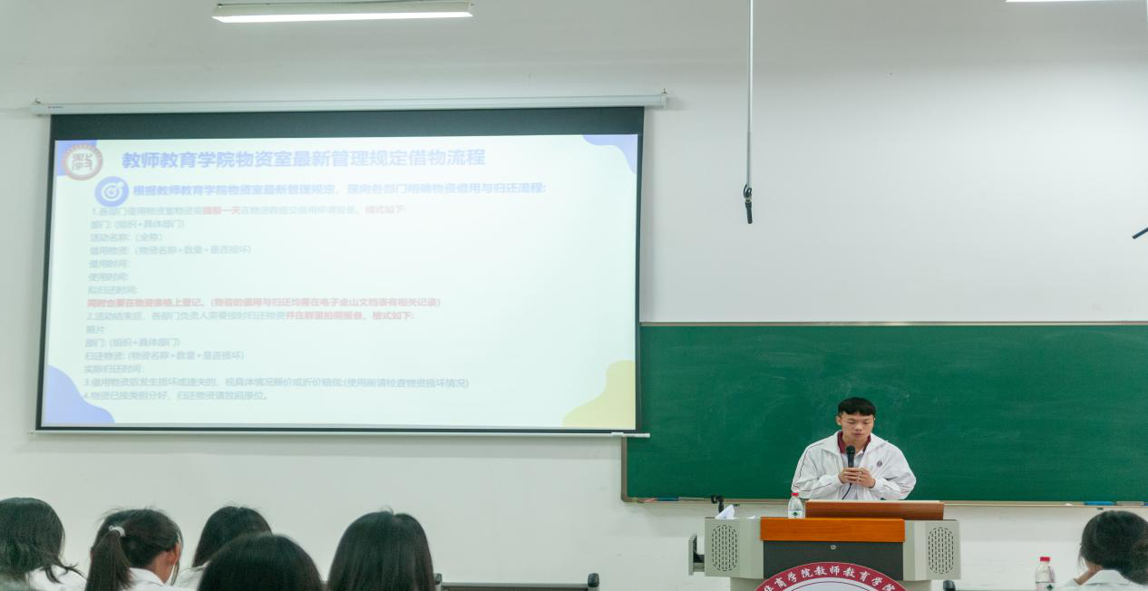 其次,学生会生活部负责人代表讲解williamhill英国官网物资室最新管理规定及物资借用流程,让团学成员更加清晰地了解物资室最新管理规定以及物资借用流程,保障学院各项活动的顺利进行。