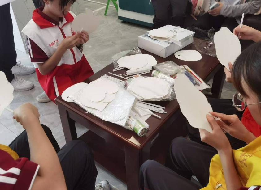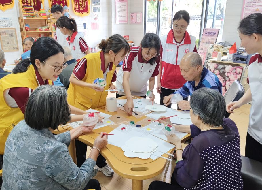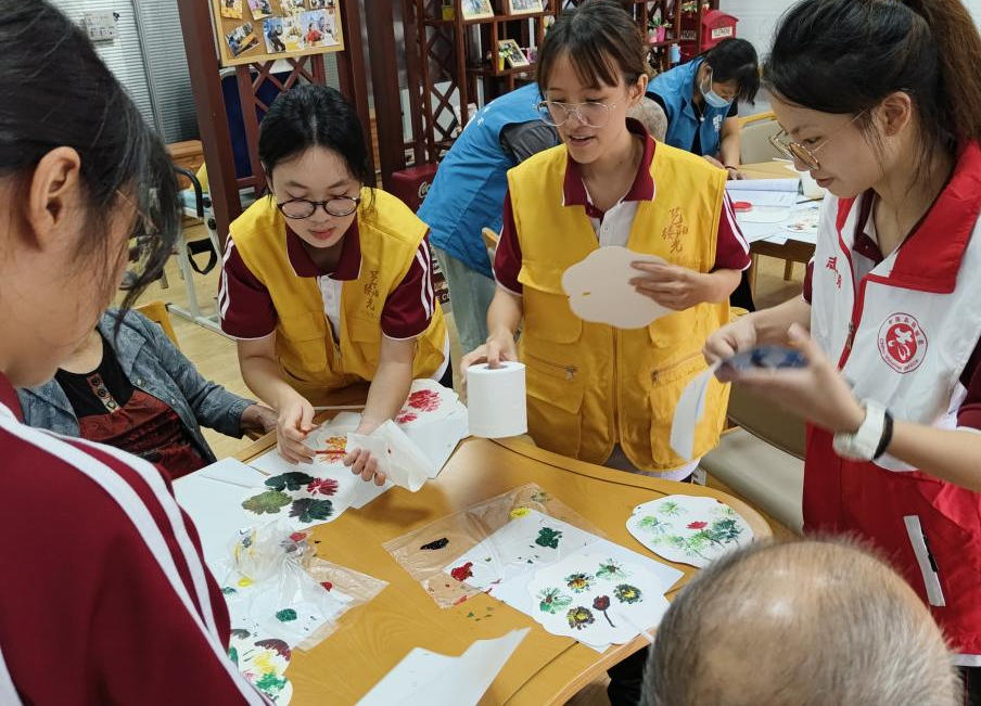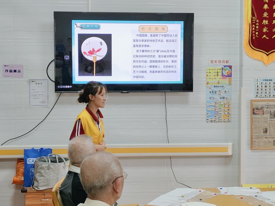 在实践过程中,志愿者们弯下腰,一笔一划地示范着如何勾勒线条、如何调配颜色,对于长者们提出的问题,志愿者们总是不厌其烦地解答,用温柔的话语鼓励他们大胆尝试。长者们虽然动作略显迟缓,但他们学习的热情却十分高涨,每一笔都画得格外认真。在志愿者们的悉心指导下,长者们逐渐掌握了一些绘画的窍门,开始发挥自己的想象力,在团扇上创作属于自己的作品。志愿者们一对一地指导老人,从制作道具到色彩的搭配,无微不至。他们用自己的行动诠释着青年的担当,引导长者们感受艺术的魅力,激发他们内心的创造力,让长者们感受到了来自社会的关爱。
