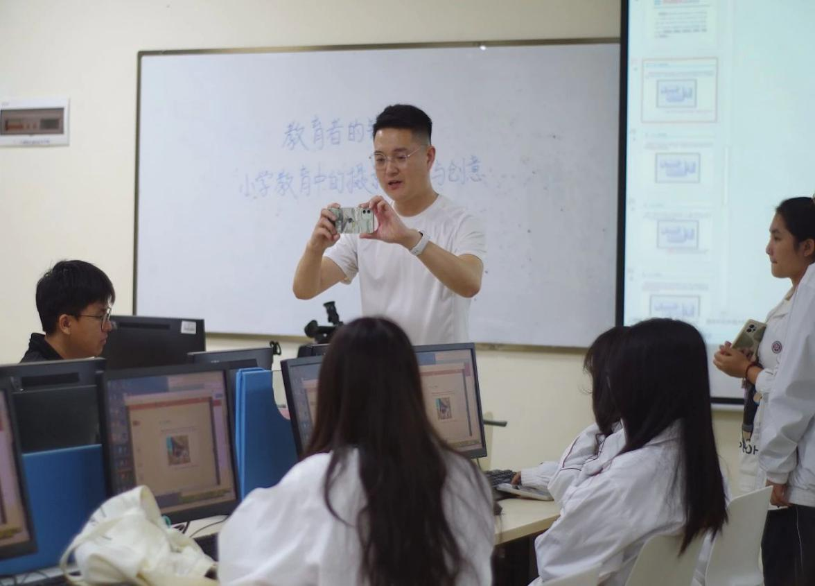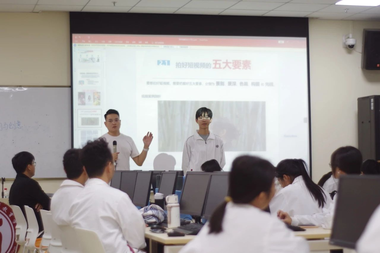 在课堂实战环节中,同学们观看完williamhill英国官网宣传视频后,邹老师指出其可完善之处,并亲自教授拍摄手法与姿势,将理论与实践相结合。讲解完推拉镜头效果后,邹老师邀请同学们上台体验,还详细介绍九宫格、二分/三分构图法等常用构图方式以及顺光、逆光等光源运用技巧,助力学生踏上摄影高手之路。