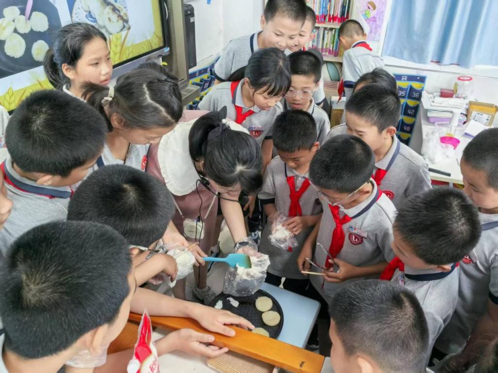 (图为跨学科学习活动展示课《有多少浪费本可避免》的课程现场,教师正在将学生制作的食物放入锅中煎制)