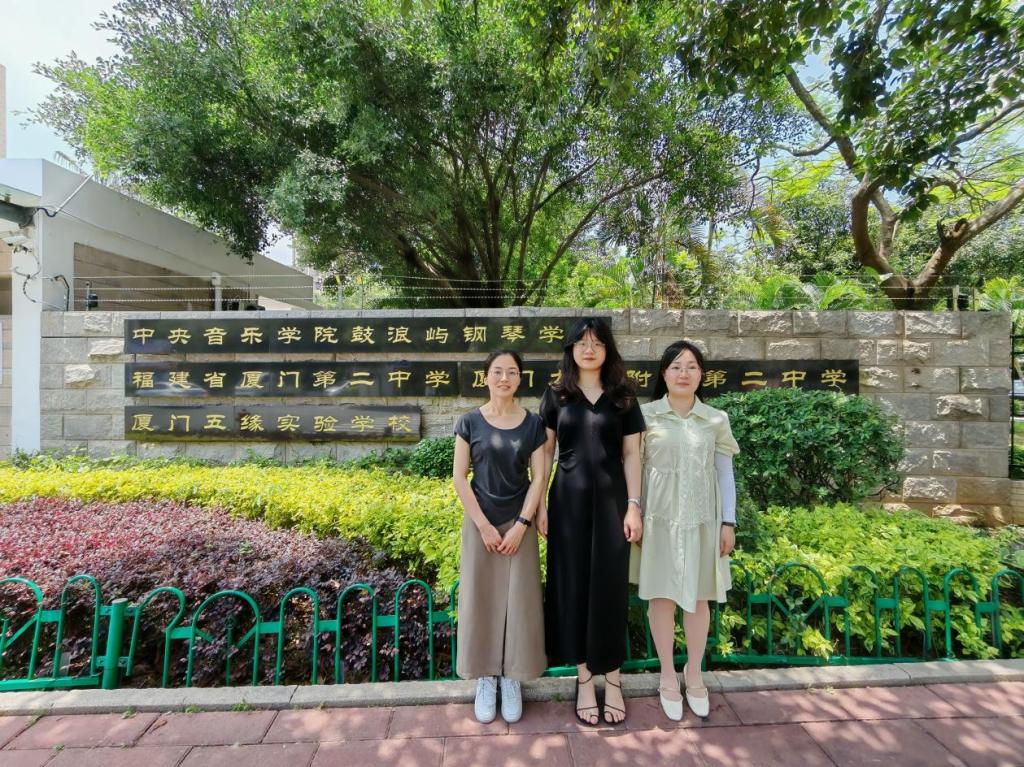 (图为三位老师在厦门五缘实验学校门口的合影,由左到右为李晓莉、田玲、魏林苹)