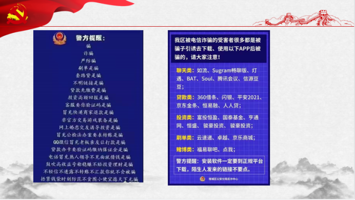 反诈工作需坚持:班会上,老师们举例叙述了诈骗的主要类型,分别是:电信诈骗类、兼职诈骗类、校园贷类。对同学们进行了反诈宣传。如果遭遇诈骗,及时联系辅导员、保卫办(82665833)或增城校区雁塔派出所(020-82742848)、四会校区新江派出所(0758-3618236);重新扫码关注广州反诈服务号,注册穗安防诈。全员参与反诈答题,提高安全意识。