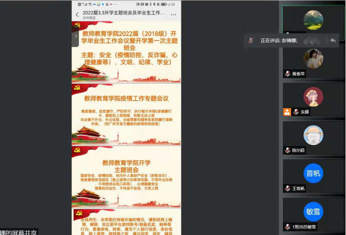 会议围绕加强理论学习(两会专题),提高政治站位和思想政治觉悟、安全(国家安全、疫情防控、反诈、心理健康、交通安全等校内外安全)、文明行为规范、纪律(遵纪守法,重温学生手册)、学业(强调以本为本,做好开学规划,抓学习,遵循教学要求,开展素质活动三笔一话、早读、百本书活动志愿服务等活动、毕业生工作,抓榜样)主题依次进行。