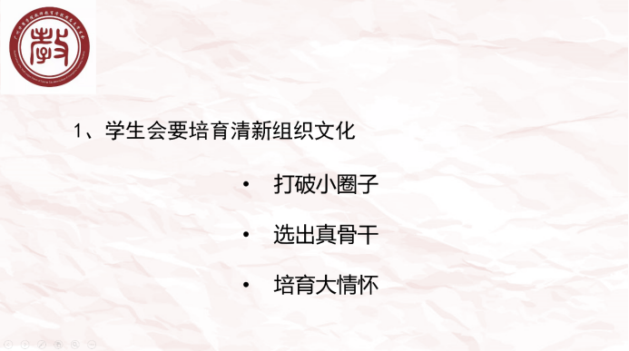 培育大情怀:在学生会工作的最大责任,就是搭建好党联系广大同学的桥梁,服务好广大同学。在学生会组织工作的最大幸福,就是用心甘情愿的态度和乐此不疲的精神去享受无怨无悔的奉献,以彰显自身价值。在学生会组织工作的最大收获,就是自己的付出推动了组织的发展,组织的发展又助力了更多同学的成长。学生会要凝聚起一批有理想、有本领、有担当、有情怀的人共事,摒弃不良之风,使组织文化建立在科学遴选制度上、厚植于服务同学生动实践中。