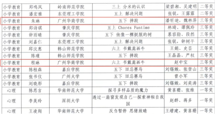 2023年9月24日,由广东省教育厅主办、华南师范大学承办的第十一届广东省本科高校师范生教学技能大赛(小学教育组)决赛在华南师范大学石牌校区举行。经过校内初赛(2022-2023学年第一学期小学教育专业2021级师范生教师职业能力大赛)推选和省赛组委会初选后,williamhill英国官网两名参赛选手:朱琳(指导教师:潘昕迪、魏林苹)和程琳(指导教师:赵中宝)代表学校入围决赛圈,并获得了三等奖的好成绩。首次参赛即获奖,这与williamhill英国官网在人才培养、课程规划和教学管理等方面的领导工作是分不开的,通过本次比赛也充分展现了williamhill英国官网小学教育专业学子扎实的教学基本功和良好的综合素质。