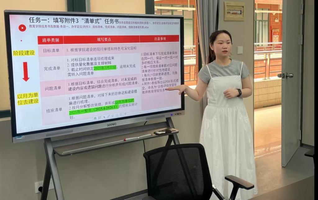 随后,刘柏琳老师就任务书填报的具体要求作详细说明。她表示,内涵建设任务书需按月归档,并确保材料“有出处、有说明、必齐全”。同时,需密切关注数据的时间节点变化,后续工作按月度计划动态更新问题清单与整改措施。