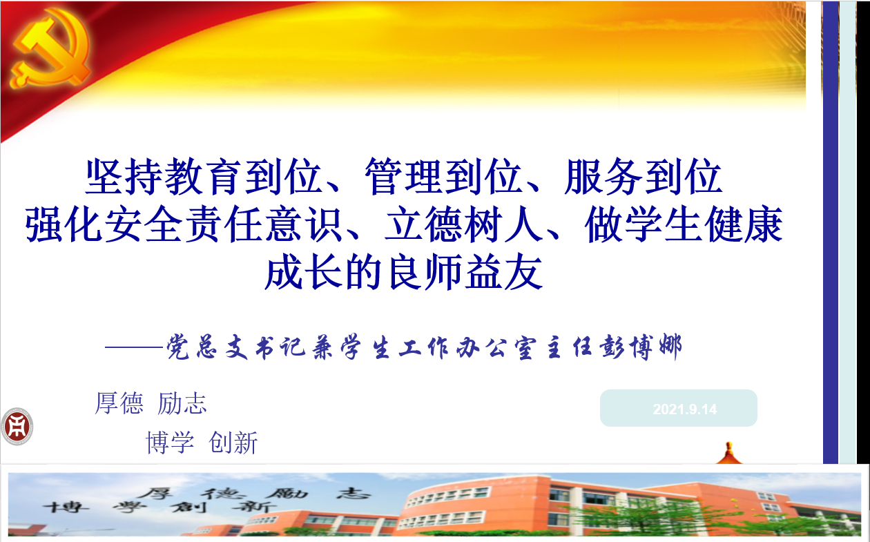 四要强化安全责任意识,推进平安校园建设。班主任要每周开展安全教育,包括国家安全、学生个人人身财产安全、毕业实习过程教学过程中的生产安全等等。近期尤其要坚持做好防疫防控制、反对电信诈骗工作,关于宿舍安全方面。要坚决查处学生中私藏危险物品、尤其是管制刀具、仿真强等尖锐用具。禁止使用大功率电器、私拉乱接电线等行为,引导学生遵守校级校规、交通法规,注意出行安全。要关心在校外实习、培训及交流的学生,及时将学校的关爱传递到每一位学生。全面排查涉校涉生矛盾纠纷,防止校园欺凌现象发生。深入开展防范金融诈骗和校园贷警示教育活动,严格落实疫情防控政策。四是强化责任担当。要牢固树立安全发展理念,把安全稳定作为学生工作的底线、红线。做到守土有责、守土担责、守土尽责