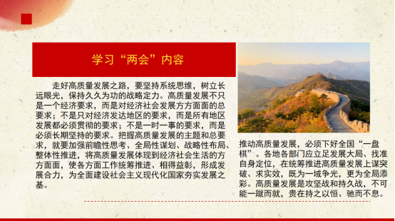 在“两个一百年”奋斗目标的历史交汇点上,全国两会确定了今后5年乃至更长时期经济社会发展的行动蓝图。贯彻落实全国“两会”精神,关键是要坚定不移走高质量发展之路,完整、准确、全面贯彻新发展理念,着力破解经济社会发展深层次问题,在更高质量、更有效率、更加公平、更可持续、更为安全的发展过程中,奋力书写发展新篇章。朱娜书记提出,希望各位党员在接下来的学习生活中不断地提升自身的政治思想理念,不断地加强对时事政治热点的关注,深入学习“两会”精神。