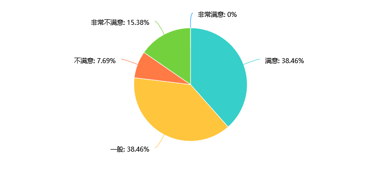 数据显示,在校生对学校提供的第二课堂、教学实践的满意度分布较为分散。满意和一般的比例相近,分别为38.46%;不满意和非常不满意的比例合计为23.07%,相对较低。需要在提供第二课堂和教学实践方面进一步改进,以提升满意度,比如通过增加课程多样性、提高教学质量、加强师资培训等方式来改善。