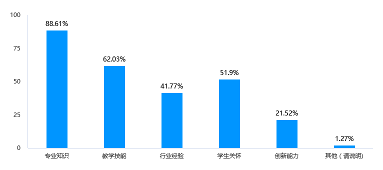 具体来看毕业生认为教师专业知识方面表现最为突出,占比达到88.61%,其次是教学技能和学生关怀,分别为62.03%和51.9%。相对而言,教师在创新能力方面表现较弱,仅占21.52%。因此,可以在教师培训和评价中重点关注教师的创新能力提升,提供相关的培训和支持,以提升教师的综合素质。