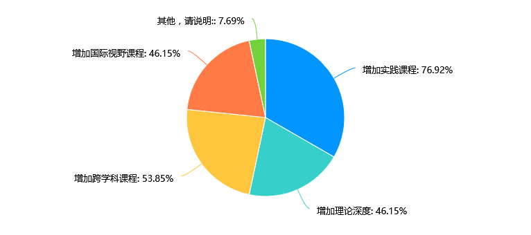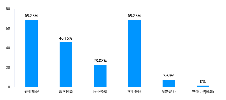 教师在专业知识和学生关怀方面表现最为突出,分别占比69.23%。教师在教学技能方面表现次之,占比46.15%。行业经验和创新能力方面的表现较弱,分别仅占比23.08%和7.69%。针对教师的行业经验和创新能力较弱的情况,可以开展相关培训和培养计划,提升教师在这两方面的能力。鼓励教师在教学过程中注重创新,引入新颖的教学方法和教学内容,以提升教学质量和吸引学生的兴趣。加强对教师的综合素质评价,不仅注重专业知识和教学技能,也要考虑行业经验、创新能力等因素,全面提升教师的综合水平。