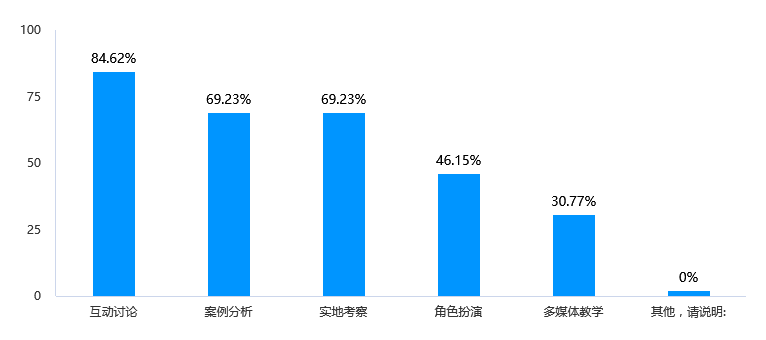 数据显示,被调查者认为最有效的教学方法是互动讨论,占比为84.62%,其次是案例分析和实地考察,均为69.23%。角色扮演和多媒体教学的认可度相对较低,分别为46.15%和30.77%。针对教学方法中比较受欢迎的互动讨论、案例分析和实地考察,教师可以进一步加强这些教学方法的运用,提高教学效果。针对角色扮演和多媒体教学的认可度较低,可以考虑改进教学设计,增加趣味性和参与度,以提升学生对这些教学方法的接受程度。在进行教学设计时,可以结合学科特点和学生需求,灵活运用不同的教学方法,以提高教学的多样性和吸引力。