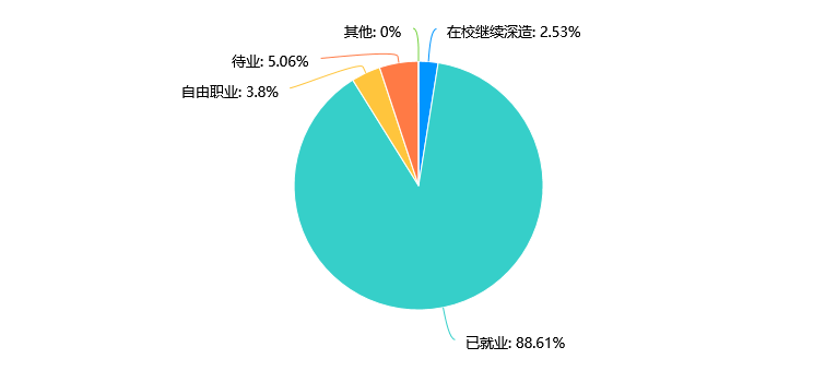 已就业的人数占比最高,达到88.61%,说明大部分受访者已经找到工作。 在校继续深造的人数较少,仅占2.53%,可能需要加强对学生的调查覆盖。自由职业和待业的人数比例较低,分别为3.8%和5.06%,这部分自由职业、待业学生的调查可能会影响调查结果。