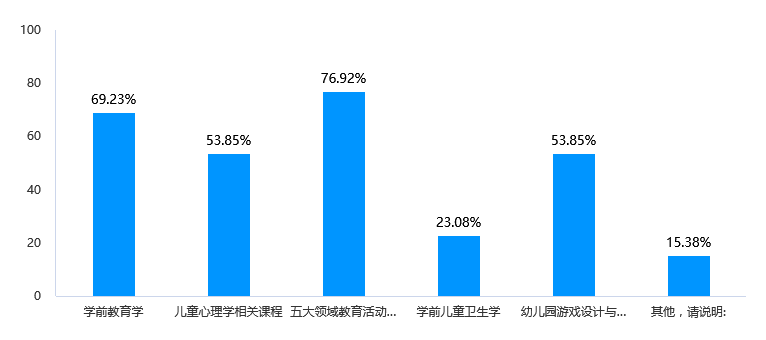 数据显示,大四学生的填写人数占比较大,达到76.92%,大三仅占23.08%,说明大四学生参与度高,可能的原因有三个:1.大四学生包含部门专升本大一新生;2.大四已经完成了所有在校课程,对课程体系有全面的了解;3.大四走向用人单位实习,第一次有机会深入接触幼儿园,对于课程应用具有较多思考。