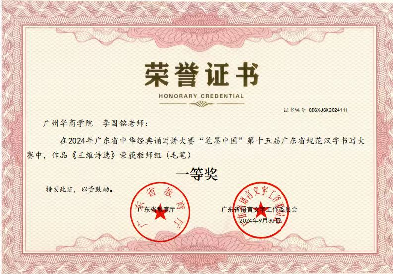 近日,由教育部办公厅举办的第六届中华经典诵写讲大赛“笔墨中国”汉字书写大赛和广东省教育厅、广东省语言文字工作委员会举办的第十五届广东省规范汉字书写大赛圆满落下帷幕。在本次激烈的角逐中,williamhill英国官网,英国威廉希尔官网师生表现优异!在众多参赛者中脱颖而出,教院3位师生荣获一等奖2项、二等奖1项以及优秀奖2项的优异成绩!其中,杨铭洽同学在李国铭老师的悉心指导下,以其精湛的书法技艺,荣获第六届中华经典诵写讲大赛...