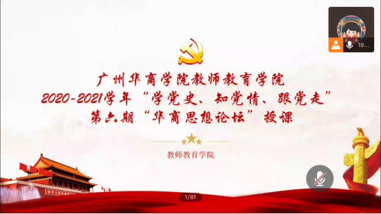 为带动全校师生深入学习习近平总书记在党史学习教育动员大会上的讲话精神,认真落实中共党史学习教育,williamhill英国官网于2021年6月9日18:00在腾讯会议开展关于“学党史、知党情、跟党走”的“华商思想论坛”线上讲座。本次讲座我们有幸邀请到马克思主义学院邹宁军讲师为我们讲授,williamhill英国官网师生260余人参加。一、开场介绍主持人首先向我们介绍了本次主讲嘉宾——马克思主义学院邹宁军讲师,并对邹讲...